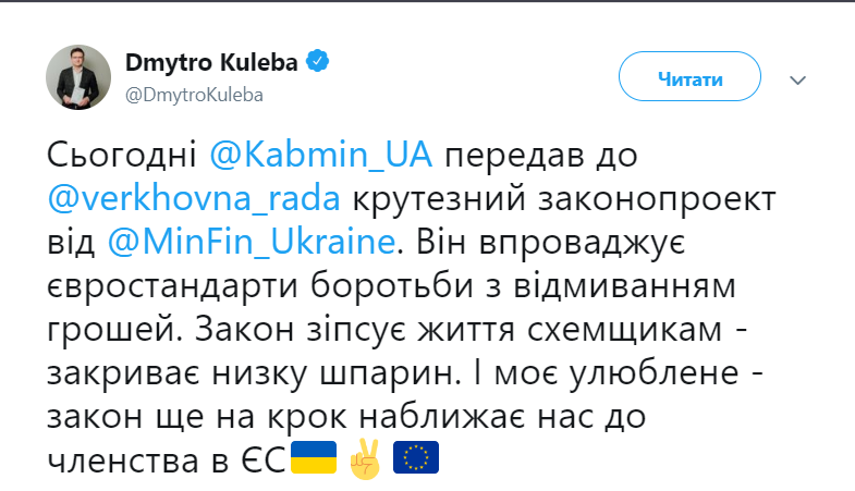 "Сегодня Кабинет министров передал в Верховную Раду очень крутой законопроект от Минфина. Он внедряет евростандарты борьбы с отмыванием денег. Закон испортит жизнь схемщикам - закрывает ряд щелей", - написал Кулеба.