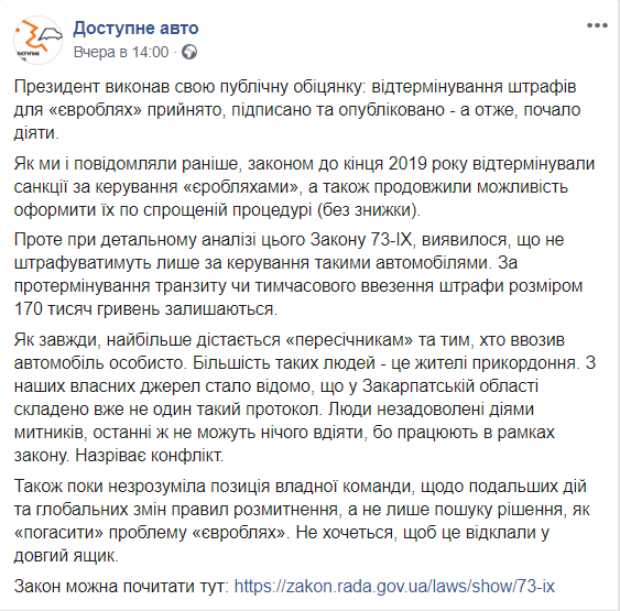 "За просрочку транзита или временного ввоза штрафы размером 170 тысяч гривен остаются. Больше всего достается "пересекателям" и тем, кто ввозил автомобиль лично. Из наших собственных источников стало известно, что в Закарпатской области составлено уже не один такой протокол", - говорится в сообщении "Доступное Авто".