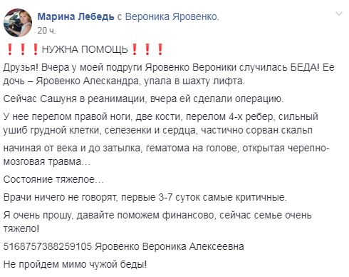В Днепре во вторник, 24 сентября, 15-летняя Александра Яровенко по неосторожности упала в шахту лифта. Девочка находится в тяжелом состоянии. Подробности о состоянии подростка сообщила подруга семьи Марина Лебедь на своей странице в Facebook.