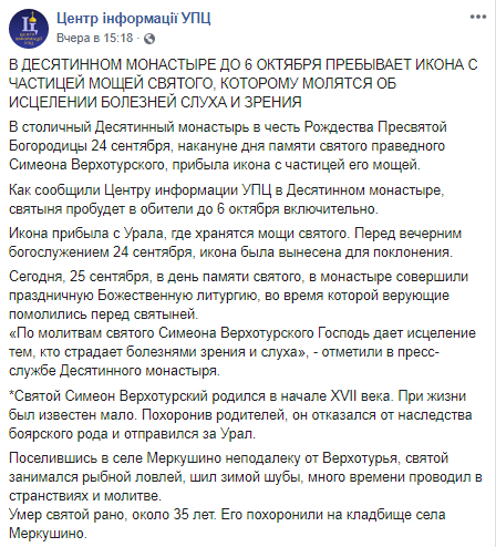 В Десятинный монастырь в Киеве привезли икону с частицей мощей святого праведного Симеона Верхотурского. Об этом сообщает Центр информации УПЦ в Facebook.