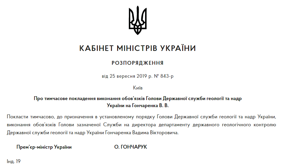 Кабинет министров 25 сентября назначил временным исполняющим обязанности главы Государственной службы геологии и недр Вадима Гончаренко. Об этом свидетельствует информация на сайте правительственного портала.
