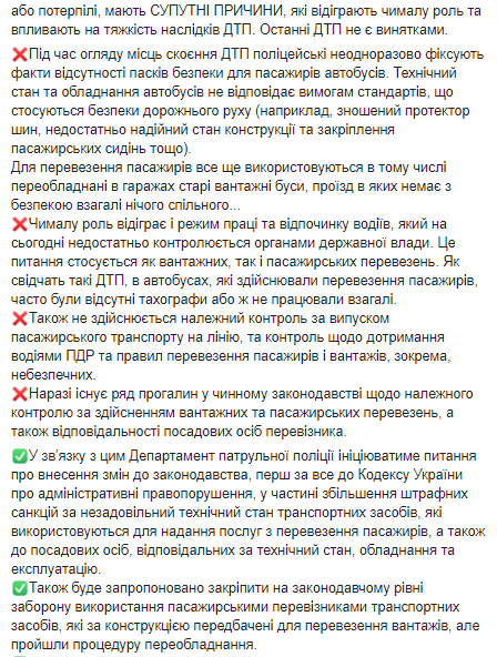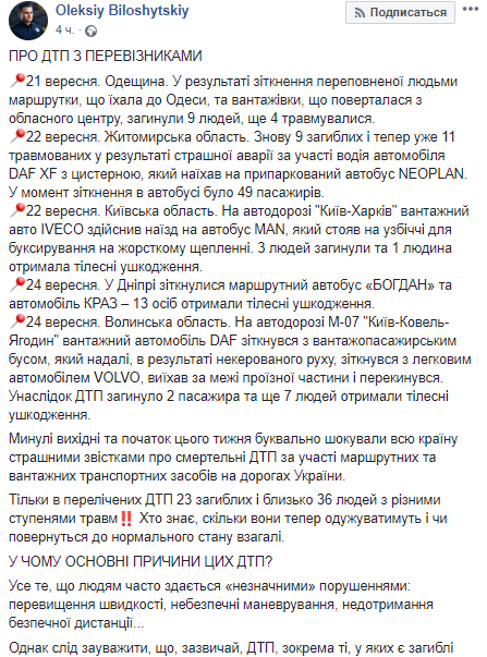 После двух жутких ДТП с участием пассажирских автобусов и грузовиков, в каждом из которых погибли по 9 человек, Департамент патрульной полиции Украины инициирует ужесточение правил пассажирских перевозок. Об этом сообщил первый заместитель начальника патрульной полиции Алексей Белошицкий на своей странице в Facebook.