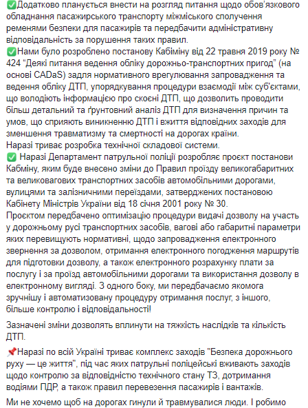 "Мы разработали постановление Кабмина №424 от 22 мая 2019 года для нормативного урегулирования внедрения и ведения учета ДТП, упорядочения процедуры взаимодействия между субъектами, обладающими информацией о совершенных ДТП, что позволит проводить более детальный и обстоятельный анализ ДТП для определения причин и условий, способствующих возникновению ДТП и принятия мер для уменьшения травматизма и смертности на дорогах страны. Сейчас идет разработка технической составляющей системы", - сообщил Белошицкий.
