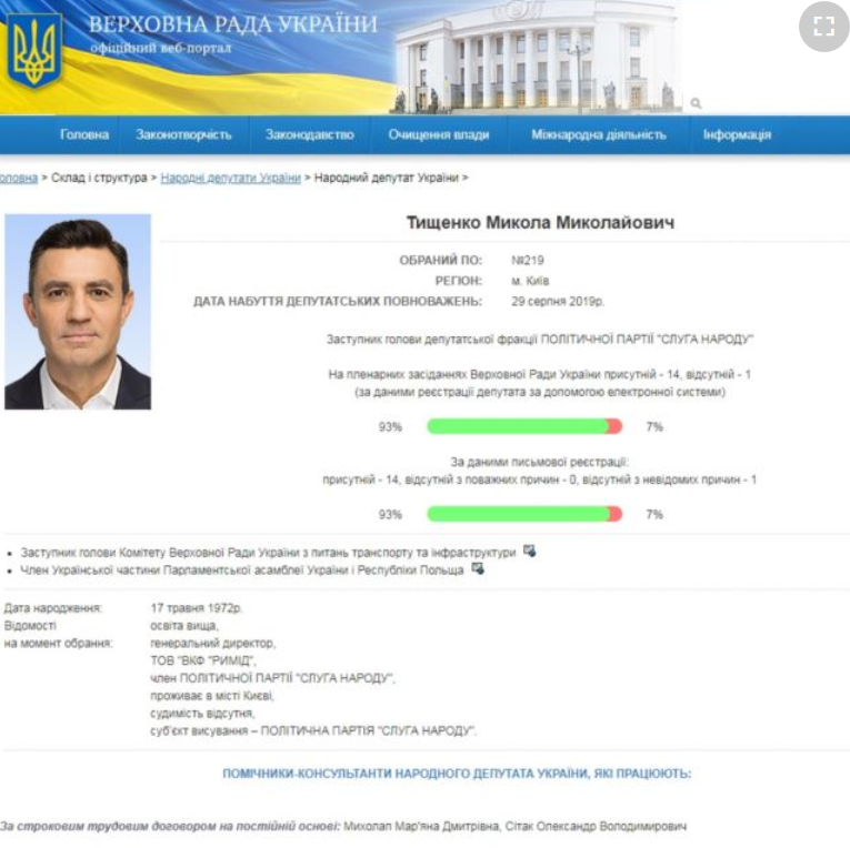 Как говорится на сайте Верховной Рады, Марьяна Михолап работает у Тищенко по срочному трудовому договору на постоянной основе.