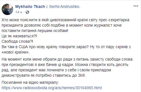 "Кто может объяснить в какой цивилизованного стране мира пресс-секретарь президента позволяет себе подобное в момент когда журналист хочет задать вопрос первым лицам! Это как называется!?", - написал Ткач.