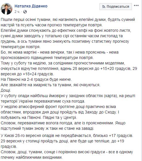 В субботу и воскресенье, 28 и 29 сентября, в Украину придет ощутимое потепление, температура поднимется до 24 градусов тепла, но ожидаются осадки. Об этом на своей странице в Facebook написала синоптик Наталья Диденко.