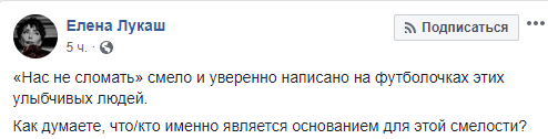Акцентировала внимание на отсутствии реального расследования дел прошлой власти и экс-министр юстиции Елена Лукаш. "Нас не сломать" смело и уверенно написано на футболочках этих улыбчивых людей. Как думаете, что/кто именно является основанием для этой смелости?" - написал юрист.