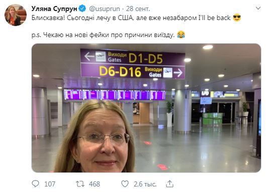 "Молния! Сегодня я лечу в США, но уже скоро я вернусь", - написала Супрун.