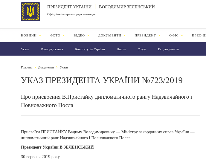 Об этом говорится в Указе №723/2019 от 30 сентября опубликован на официальном сайте президента Украины.