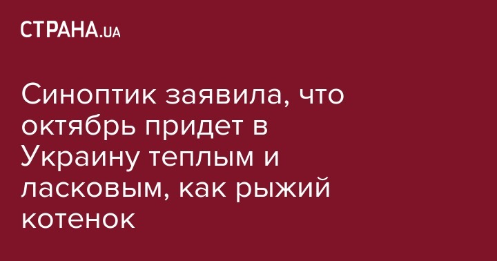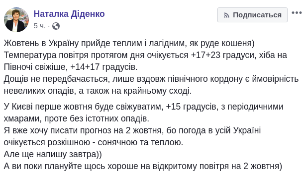 Синоптик Наталья Диденко написала, что первый день октября в Украине будет теплым и ласковым, как рыжий котенок и дала прогноз погоды на вторник, 1 октября, на своей странице в Facebook.
