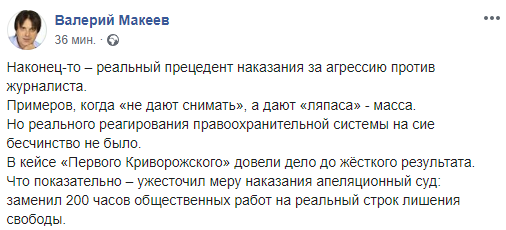 "Наконец-то – реальный прецедент наказания за агрессию против журналиста. Примеров, когда "не дают снимать", а дают "ляпаса" - масса. Но реального реагирования правоохранительной системы на сие бесчинство не было. В кейсе "Первого Криворожского" довели дело до жесткого результата. Что показательно – ужесточил меру наказания апеляционный суд: заменил 200 часов общественных работ на реальный строк лишения свободы" - написал представитель НСЖУ в Facebook.