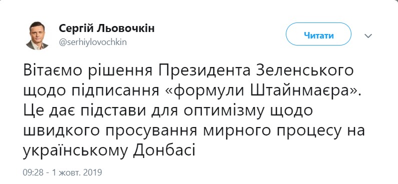 "Приветствуем решение президента Зеленского относительно подписания "формулы Штайнмайера". Это даёт основания для оптимизма относительно быстрого продвижения мирного процесса на украинском Донбассе", - написал Левочкин в твите.