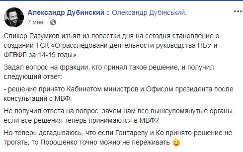 "Спикер Разумков изъял из повестки дня на сегодня становление о создании ВСК "О расследовани деятельности руководства НБУ и ФГВФЛ за 2014-2019 годы", - сообщил Дубинский.