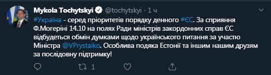 "Украина - среди приоритетов повестки дня ЕС. При содействии Федерики Могерини 14 октября на полях Совета министров иностранных дел ЕС состоится обмен мнениями по украинскому вопросу с участием министра Вадима Пристайко. Особая благодарность Эстонии и другим нашим друзьям за последовательную поддержку!", - написал он.