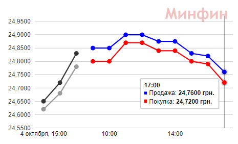 В банках курс доллара с утра был такой: покупка от 24,45 до 24,75 грн, продажа от 24,95 до 25,25 грн.