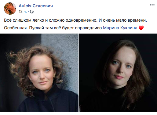 "Всё слишком легко и сложно одновременно. И очень мало времени. Особенная. Пускай там всё будет справедливо, Марина Куклина", – написала в Facebook Анисия Стасевич.