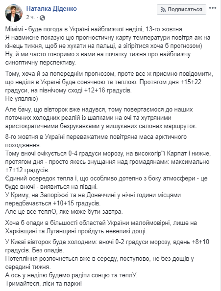 "Потепление начнется уже в среду, постепенно, не без дождей в середине недели. А вот в воскресенье будем радоваться солнцу и теплу", - написала Диденко.