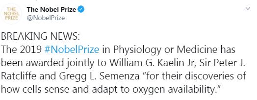 В понедельник, 7 октября, присудили Нобелевскую премию по медицине за 2019 год. Ее решили отдать Уильяму Келину, Петеру Ратклиффу и Греггу Семенце за открытие того, как живые клетки реагируют на присутствие кислорода. Об этом сказано в Twitter-аккаунте Нобелевской премии.