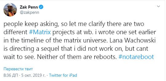 Еще в 2017 году стало известно, что кинокомпания планирует снять новый фильм в дополнение к оригинальной трилогии "Матрица". Именно над ней работает Зак Пенн. По его словам, это будет не ремейк и не перезапуск, а приквел, действия которого будут разворачиваться до событий выпущенных фильмов.