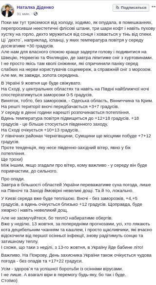 Диденко добавила, что на Покрова, День защитника Украины, который будет 14 октября, также ожидается прекрасная погода - без осадков и +17...+22 градуса.