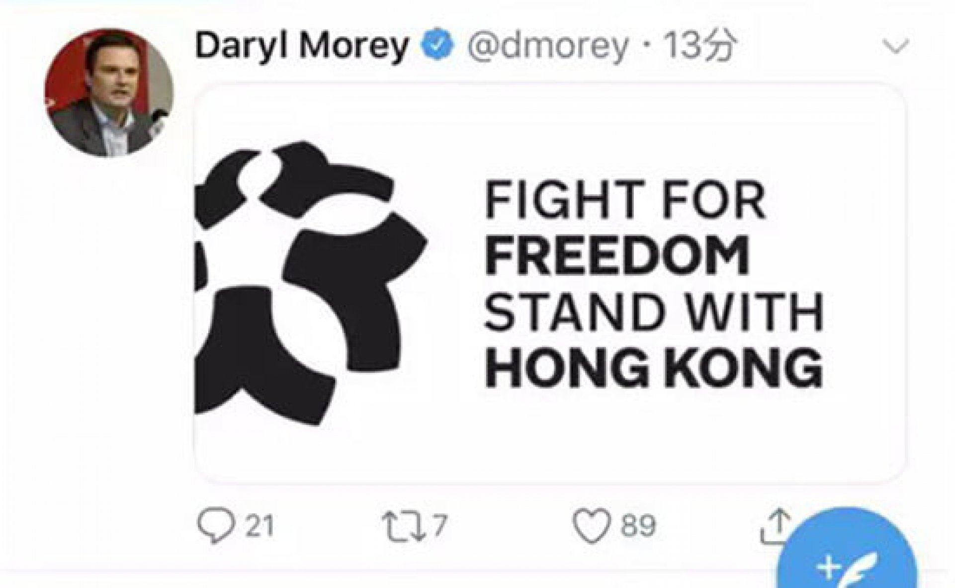 Несмотря на то, что первоначальное сообщение было удалено через несколько часов после публикации, а позже Мори написал, что "не хотел, чтобы твит оскорблял фанатов Rockets и друзей в Китае", 8 октября спортивный канал Центрального телевидения Китая отменил трансляций всех матчей НБА.