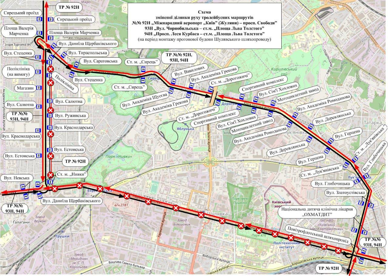 • троллейбусный маршрут № 94Н "Просп. Леся Курбаса - ст. м. "Площадь Льва Толстого" организуется по трассе: просп. Леся Курбаса - Кольцевая дорога - просп. Победы - ул. Д. Щербакивского - ул. Стеценко - ул. Щусева - ул. Ю. Ильенко - ул. Сечевых Стрельцов - ул. В. Черновола - просп. Победы - бульв. Т. Шевченко - ул. Большая Васильковская - ст. м. "Площадь Льва Толстого" (в обратном направлении ул. Льва Толстого - ул. Владимирская - бульв. Тараса Шевченко).