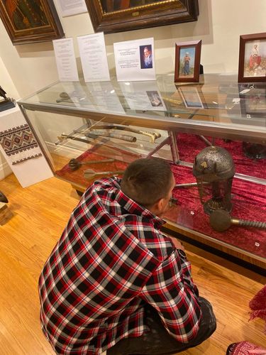 Александр Усик с заинтересованностью осмотрел экспозиции музея - казацкие раритеты, столетний украинский морской флаг из Севастополя и сфотографировался с уникальным, аутентичным бунчуком.