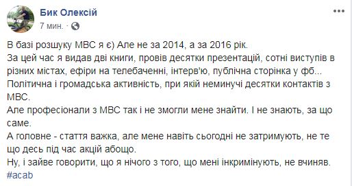 "...участник нашего "Автопробега добра и счастья", оказывается, с 2014-го объявлен в розыск по ст. 187 (Разбой). Серьезная статья, криминал. Но он об этом и не догадывался, – делал недавно новый паспорт, проезжал много раз через блокпосты. Это Бык Алексей – активный и известный многим участник Революции Достоинства, доброволец, участник боевых действий в составе Правого сектора в 2014 году", - написал Кутепов.