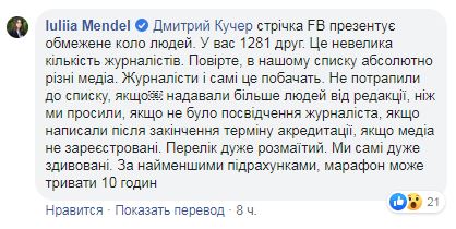 "Перечень очень разнообразен. Мы сами очень удивлены. По самым скромным подсчетам, марафон может продолжаться 10 часов", - написала Мендель. Перед этим она написала, что аккредитовано более 300 журналистов для участия в пресс-марафоне.