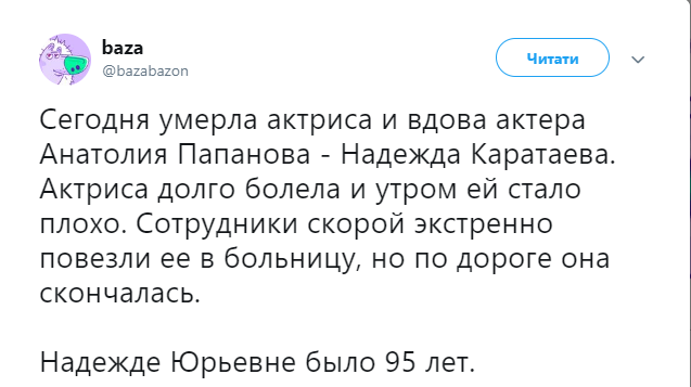 "Сегодня умерла актриса и вдова актера Анатолия Папанова - Надежда Каратаева. Актриса долго болела и утром ей стало плохо. Сотрудники скорой экстренно повезли ее в больницу, но по дороге она скончалась", - говорится в сообщении.