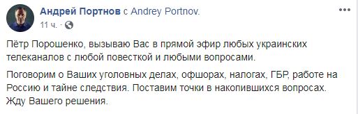 "Петр Порошенко, вызываю Вас в прямой эфир любых украинских телеканалов с любой повесткой и любыми вопросами", - заявил Портнов.
