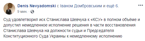 В пятницу, 11 октября, Окружной административный суд Киева удовлетворил иск Станислава Шевчука к Конституционному суду Украины в полном объеме. ОАСК допустил немедленное исполнение решения в части восстановления Станислава Шевчука на должности судьи и Председателя Конституционного Суда Украины к немедленному исполнению.