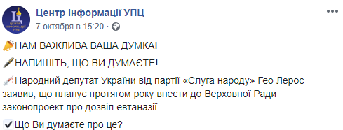 Пост Гео Лероса процитировал центр УПЦ, поинтересовавшись на своей странице в Facebook у подписчиков, что они думают об эвтаназии.