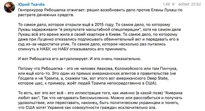 "Генпрокурор Рябошапка отжигает: решил возобновить дело против Елены Лукаш по растрате денежных средств.