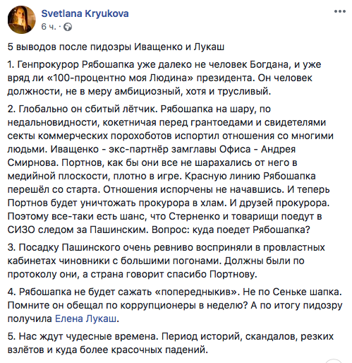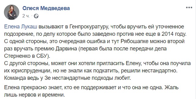 "Елена Лукаш вызывают в Генпрокуратуру, чтобы вручить ей уточненное подозрение по делу, которое было заведено против нее еще в 2014 году. С одной стороны, это очередная ошибка, и тут Рябошапке можно второй раз вручать премию Дарвина (первая была после передачи дела Стерненко в СБУ). С другой стороны, может, они хотели пригласить Елену, чтобы она поучила их юриспруденции, но не знали, как подкатить, решили нестандартно. Команда ведь у Зе нестандартные подходы любит.