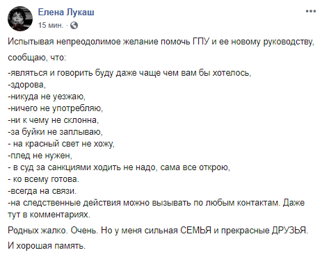 На своей странице в социальной сети Facebook Елена Лукаш уточнила, что явиться в Генпрокуратуру за уточненным подозрением ей нужно 17 октября.