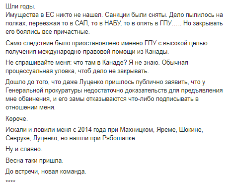 "Короче. Искали и ловили меня с 2014 года при Махницком, Яреме, Шокине, Севруке, Луценко, но нашли при Рябошапке. Ну и славно. Весна таки пришла. До встречи, новая команда", – добавила Лукаш.