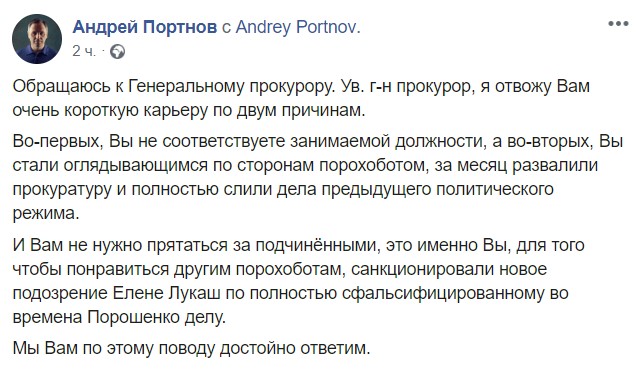 И Вам не нужно прятаться за подчиненными, это именно Вы, для того чтобы понравиться другим порохоботам, санкционировали новое подозрение Елене Лукаш по полностью сфальсифицированному во времена Порошенко делу. Мы Вам по этому поводу достойно ответим", – написал Портнов.
