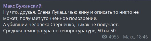 "Ну что, друзья, Елена Лукаш, чью вину и описать-то никто не может, получает уточненное подозрение. А убивший человека Стерненко никак не получает. Средняя температура по Генпрокуратуре 50 на 50", – написал он у себя в Телеграме.