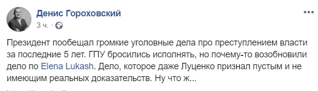 "Президент пообещал громкие уголовные дела по преступлениям власти за последние 5 лет. ГПУ бросилась исполнять, но почему-то возобновили дело по Elena Lukash. Дело, которое даже Луценко признал пустым и не имеющим реальных доказательств. Ну что ж..." – написал Гороховский.