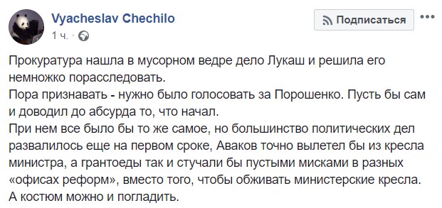 Пора признавать – нужно было голосовать за Порошенко. Пусть бы сам и доводил до абсурда то, что начал. При нем все было бы то же самое, но большинство политических дел развалилось еще на первом сроке, Аваков точно вылетел бы из кресла министра, а грантоеды так и стучали бы пустыми мисками в разных "офисах реформ", вместо того чтобы обживать министерские кресла. А костюм можно и погладить", – написал он в Facebook.