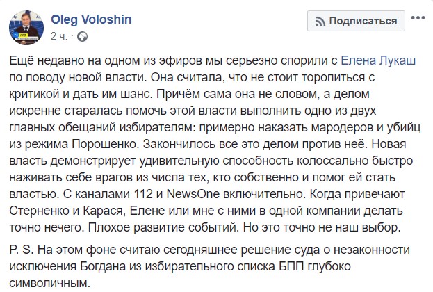 "Еще недавно на одном из эфиров мы серьезно спорили с Елена Лукаш по поводу новой власти. Она считала, что не стоит торопиться с критикой и дать им шанс. Причем сама она не словом, а делом искренне старалась помочь этой власти выполнить одно из двух главных обещаний избирателям: примерно наказать мародеров и убийц из режима Порошенко. Закончилось все это делом против нее. Новая власть демонстрирует удивительную способность колоссально быстро наживать себе врагов из числа тех, кто, собственно, и помог ей стать властью. С каналами "112" и NewsOne включительно. Когда привечают Стерненко и Карася, Елене или мне с ними в одной компании делать точно нечего. Плохое развитие событий. Но это точно не наш выбор.