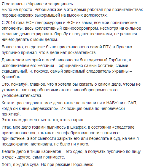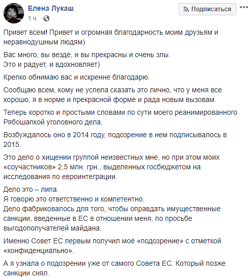 "Теперь коротко и простыми словами по сути моего реанимированного Рябошапкой уголовного дела. Возбуждалось оно в 2014 году, подозрение в нем подписывалось в 2015. Это дело о хищении группой неизвестных мне, но при этом моих "соучастников" 2,5 млн. грн., выделенных госбюджетом на исследования по евроинтеграции. Дело это – липа. Я говорю это ответственно и компетентно. Дело фабриковалось для того, чтобы оправдать имущественные санкции, введенные в ЕС в отношении меня, по просьбе выгодополучателей майдана", - рассказала юрист.