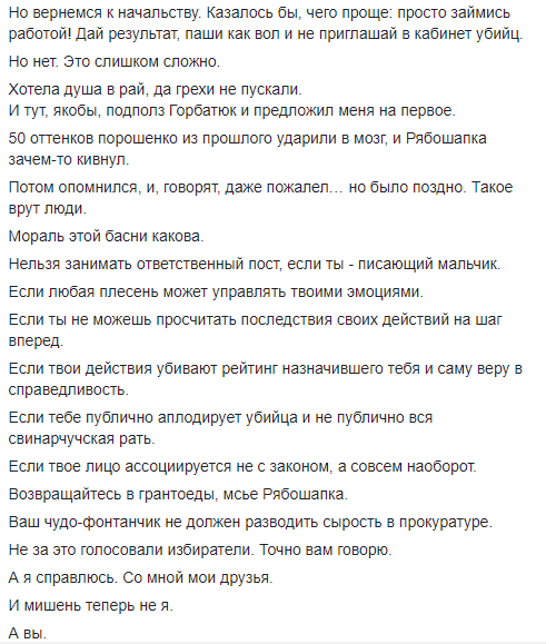 "Я ждала суда. Но при режиме Порошенко. А дождалась при Зеленском. Генпрокурор Рябошапка решился реанимировать порохоботский мусор", - добавила Лукаш.