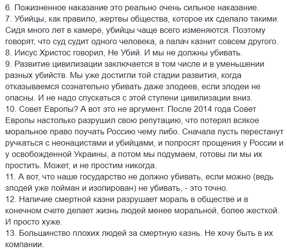 А вот российский политолог Сергей Марков привел основной набор аргументов со стороны противников смертной казни: