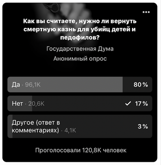 На момент подготовки материала в голосовании приняли участие 120 тысяч человек. "За" возвращение смертной казни выступили 80% опрошенных, или 96 тысяч пользователей. "Против" – 17%, или 20 тысяч человек.