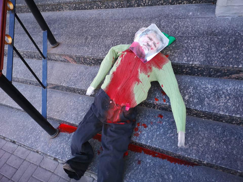 15:29 Тем временем на ступеньки центральной синагоги Киева кто-то бросил "окровавленное" чучело Коломойского. Фото опубликовал в соцсетях экс-нардеп Игорь Мосийчук.