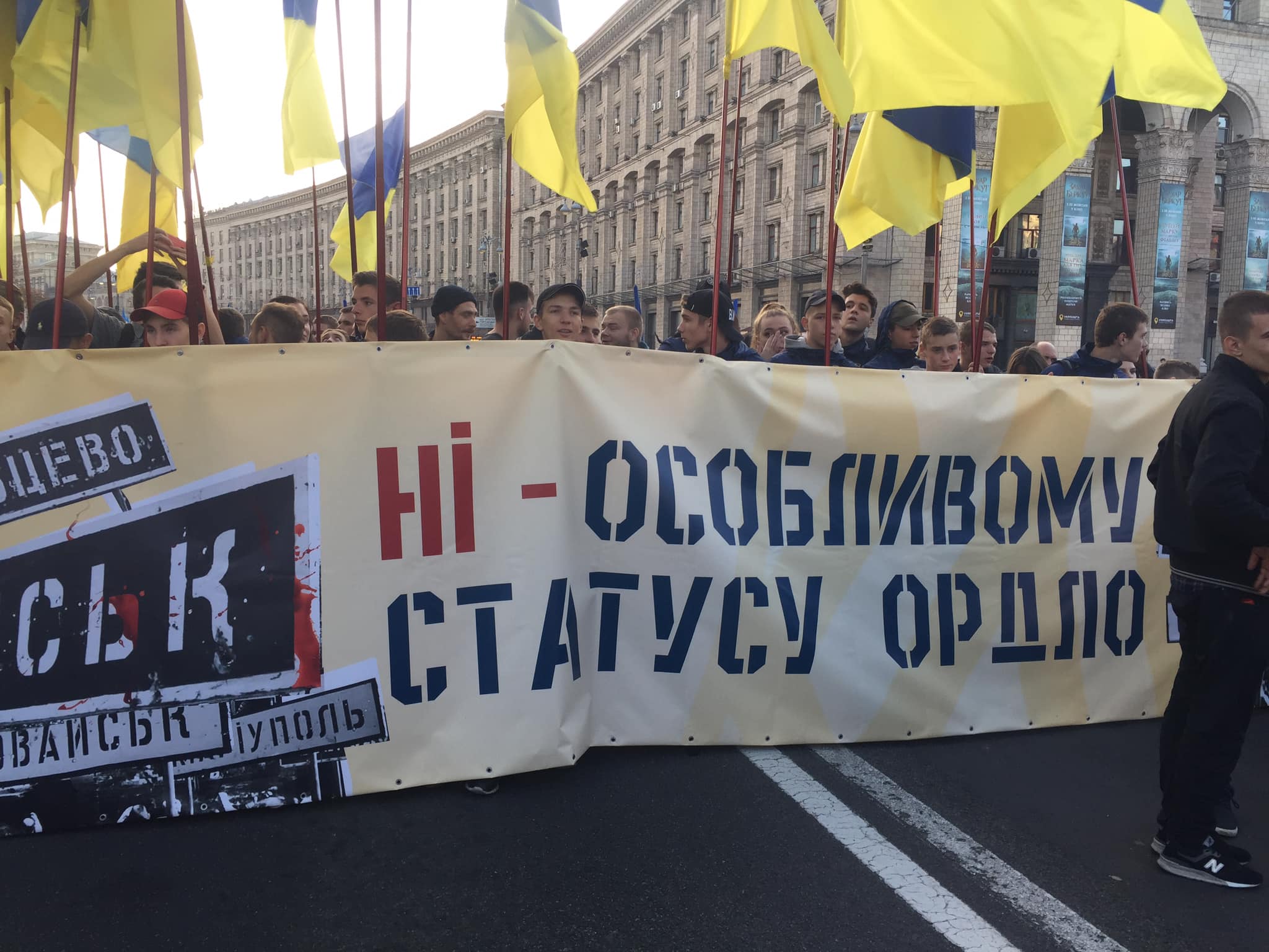 Традиционно это день торжеств для националистов и ветеранов АТО. А в этом году его превращают в политическую манифестацию: сегодняшний марш прошел в рамках Штайнмайер-майдана - акций против разведения войск и выборов на Донбассе.