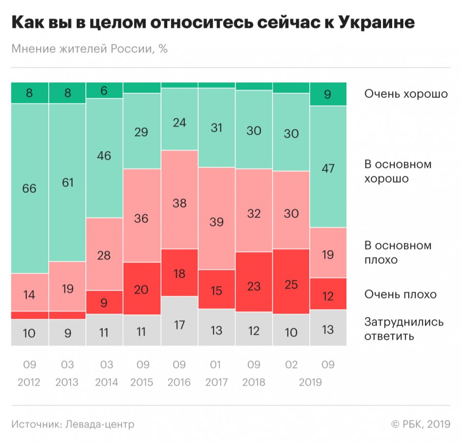 По данным исследования, за период с февраля по сентябрь 2019 года в полтора раза выросла доля россиян, оценивающих свое отношение к Украине как "хорошее". Положительное отношение к соседнему государству декларируют 56% россиян (47% в основном хорошо и 9% очень хорошо), что является максимальным показателем в период начиная с апреля 2014 года.