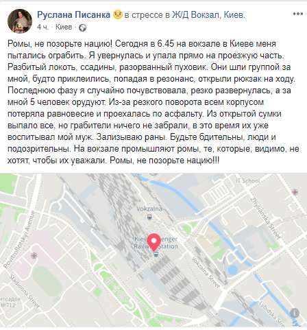 "Из открытой сумки выпало все, но грабители ничего не забрали, в это время их уже воспитывал мой муж. Зализываю раны. Будьте бдительны, люди и подозрительны. На вокзале промышляют ромы, те, которые, видимо, не хотят, чтобы их уважали", - предостерегла Руслана Писанка.